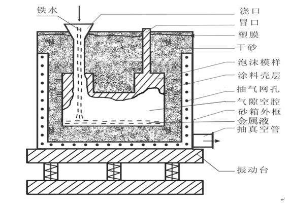 消失模鑄造在實(shí)施振動(dòng)澆注時(shí),其操作程序是:①對(duì)已密封好的砂箱(鑄型)實(shí)施抽真空并調(diào)節(jié)至合適的負(fù)壓度→②啟動(dòng)振動(dòng)臺(tái)→③在合適的負(fù)壓下對(duì)鑄型邊振動(dòng)邊澆注→澆注完畢后維持負(fù)壓和振動(dòng)至鑄件基本凝固為止→停止振動(dòng),同時(shí)停止抽真空。整個(gè)空殼(或?qū)嵭?振動(dòng)澆注過(guò)程完畢。